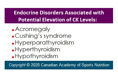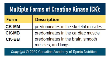 Creatine kinase (CK) is an enzyme that catalyzes the reversible transfer of phosphate from phosphocreatine (PCr) to ADP to form creatine and ATP. An increase in plasma CK is usually associated with DOMS (delayed onset muscle soreness). The severe and rapid breakdown of muscle fibers leading to the release of myoglobin, a muscle protein, into the bloodstream is called “rhabdomyolysis“.