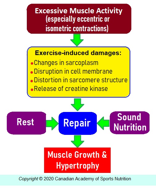As previously mentioned, exercise-induced muscle soreness results from microscopic muscle damage, which is associated with plasma CK elevation. The exact mechanisms of muscle growth are not fully known yet. However, it has been postulated that muscle damage followed by repair mechanisms leads to muscle growth. Studies using radioactive tracer show that muscle lengthening occurs mainly by adding new sarcomeres to the fiber at the junction of muscle and tendon.