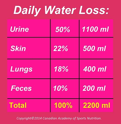 An average person with little or no exercise loses about 2200 ml (2.2 L) of water daily. For the daily water loss, see the table below.