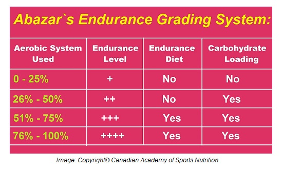 Athletes who participate in a high – intensity endurance sport event or training session require carbohydrate loading. As a rule of thumb, any sport events in which aerobic system is used more than 25% requires carbohydrate loading (see the table below), or it is recommended in an endurance sport event lasting longer than 90 minutes.
