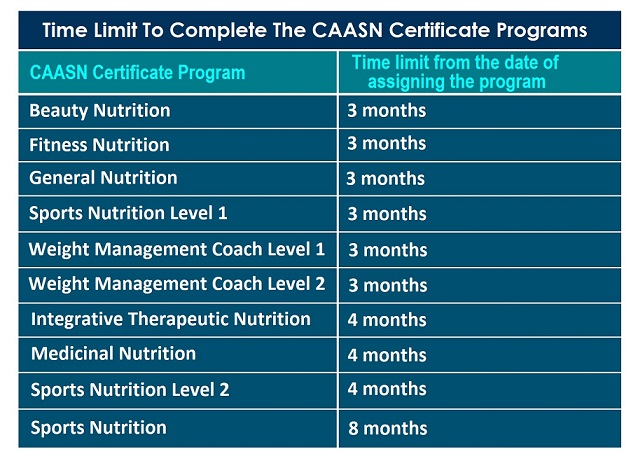Depending on the programs the students would select, it is expected that students to be able to complete the program in 3 to 8 months ( See the CAASN new policies below). Students will be given up to 30 days extra time to review and study their materials for the exam. The academy will notify students of the date of the exam.