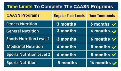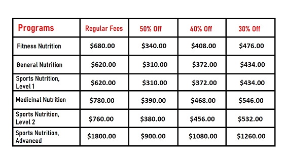 We are celebrating the 11th anniversary of the Canadian Academy of Sports Nutrition. As an appreciation to our readers, viewers, students, and graduates, we have reduced tuition fees for all CAASN courses by 30% to 50%. Also, we have doubled the time limits to complete the courses (see the chart below).